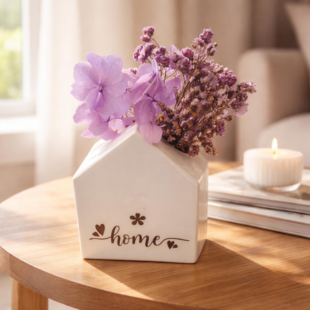 Dieses stilvolle Deko-Haus aus Keramik bringt mit zarten Trockenblumen und klarer Form eine warme, wohnliche Atmosphäre in jeden Raum. Das Besondere: Die Aufdrucke sind frei wählbar – ob Name, Spruch oder persönliches Motiv. So entsteht ein individuelles Designstück, das perfekt zu deinem Zuhause oder als persönliches Geschenk passt.