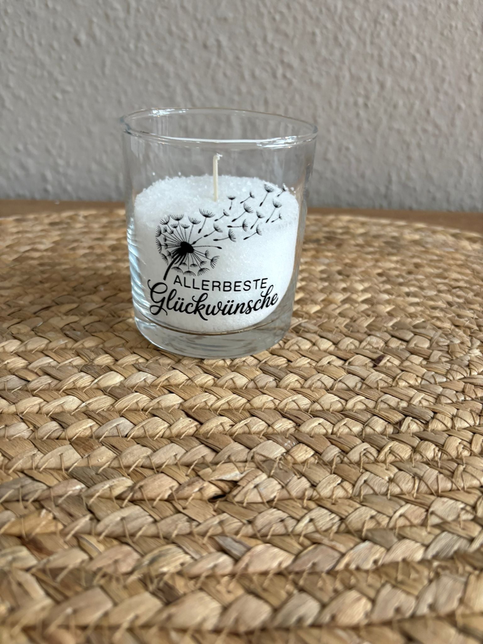 Eine kleine, feine Kerze voller persönlicher Wärme: In ein schlichtes Glas gefüllt, liegt das weiße Kerzengranulat wie frisch gefallenes Puderzucker. Der Docht steht bereit, um ein sanftes Licht zu schenken. Die filigrane Pusteblume auf dem Glas scheint Wünsche in die Luft zu tragen, während die Worte „Allerbeste Glückwünsche“ leise daran erinnern, dass dieses Licht kein Zufall ist – sondern mit Liebe und Zeit selbst gemacht wurde. Eine kleine Geste, die sagt: Ich habe an dich gedacht.