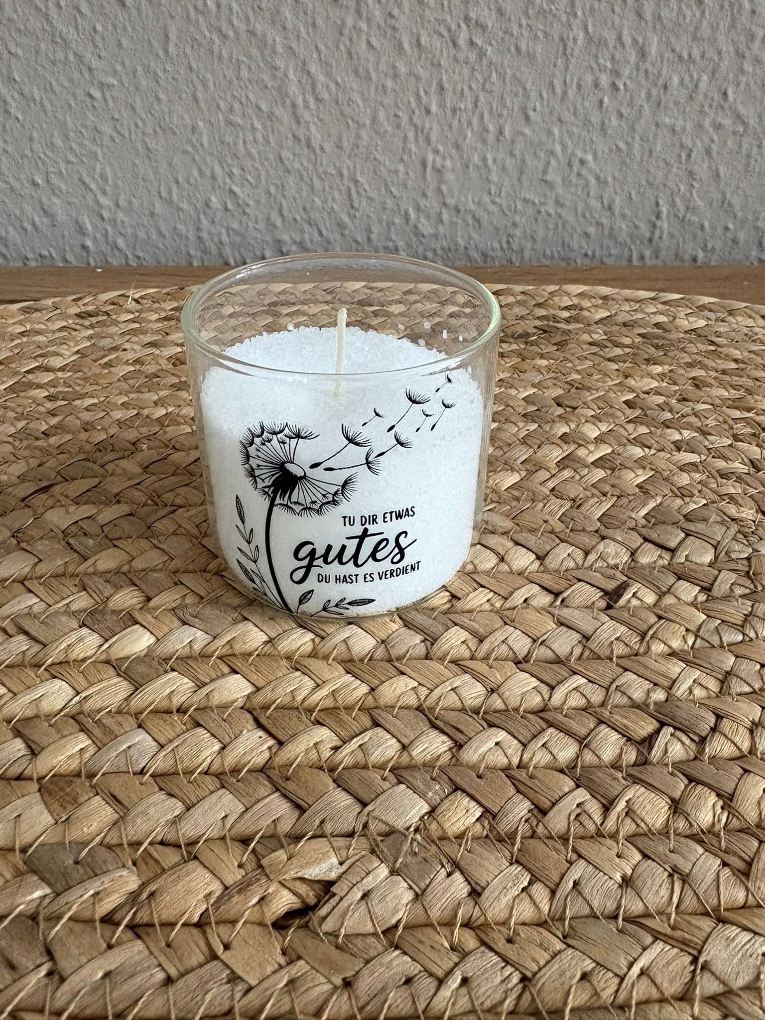 Eine kleine, feine Kerze voller persönlicher Wärme: In ein schlichtes Glas gefüllt, liegt das weiße Kerzengranulat wie frisch gefallenes Puderzucker. Der Docht steht bereit, um ein sanftes Licht zu schenken. Die filigrane Pusteblume auf dem Glas scheint Wünsche in die Luft zu tragen, während die Worte „Allerbeste Glückwünsche“ leise daran erinnern, dass dieses Licht kein Zufall ist – sondern mit Liebe und Zeit selbst gemacht wurde. Eine kleine Geste, die sagt: Ich habe an dich gedacht.