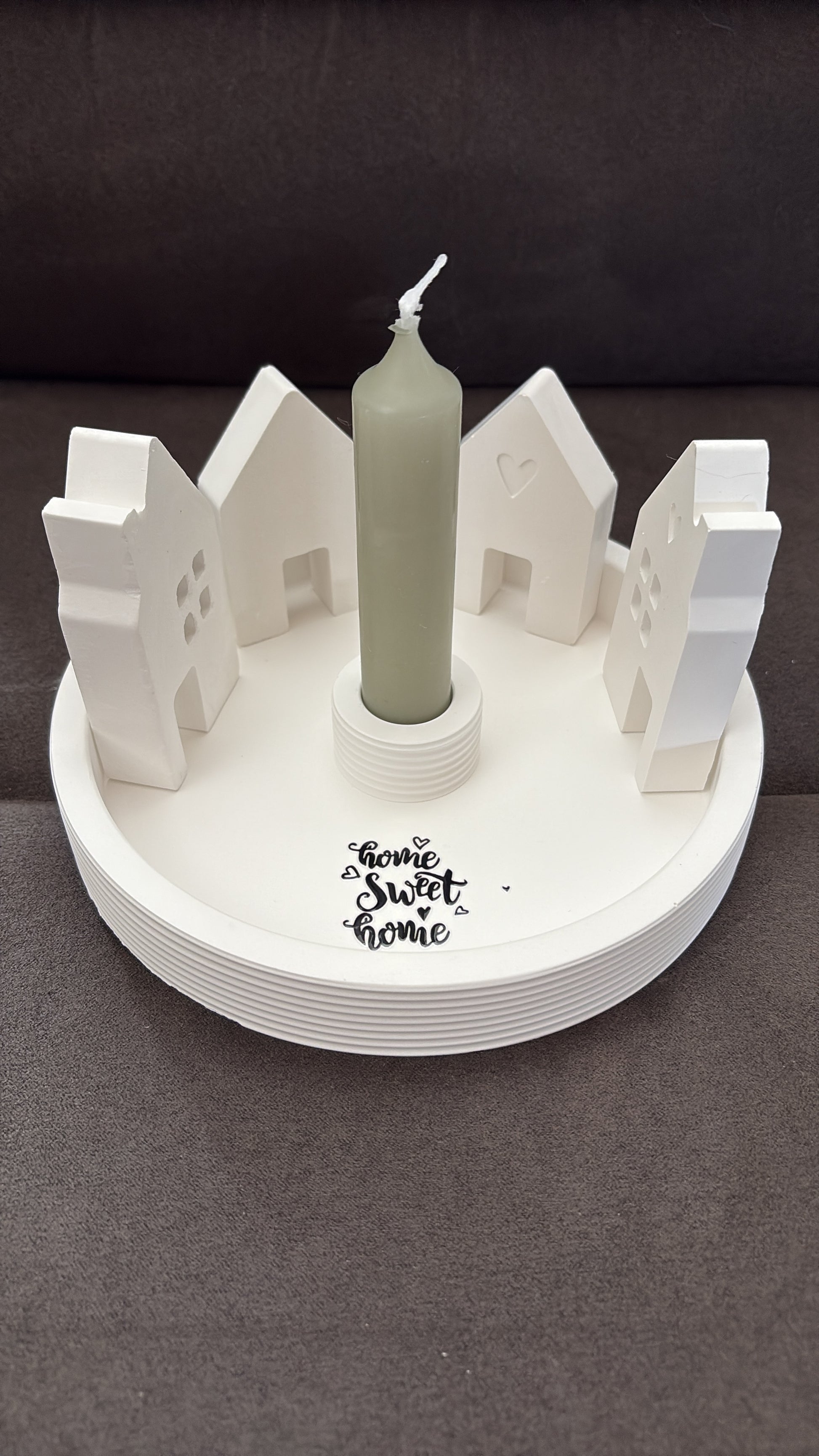 Dieses liebevoll gestaltete Kerzen-Arrangement mit kleinen weißen Häuschen im Kreis versprüht Wärme und Geborgenheit. In der Mitte thront eine schlichte Kerze – perfekt, um gemütliche Abende stimmungsvoll zu untermalen. Das süße Detail “Home Sweet Home” rundet das Ganze ab und macht es zu einem echten Blickfang im Wohnzimmer. 🏡💛