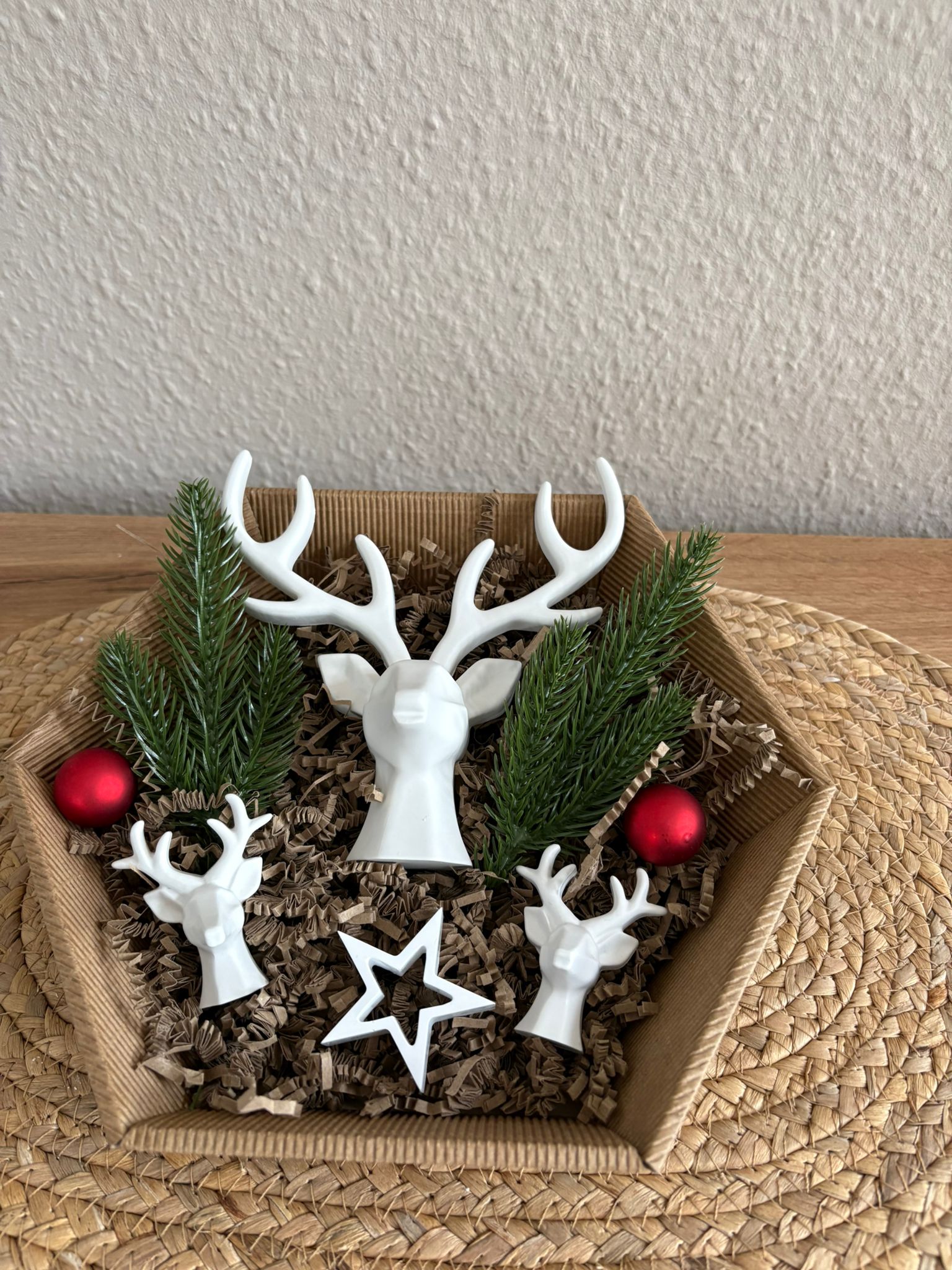 Weiße Hirschfiguren, zarte Tannenzweige und rote Kugeln vereinen sich zu einer stilvollen Deko, die Wärme und Festlichkeit ausstrahlt. Das schlichte, moderne Design bringt den Zauber der Winterzeit auf elegante Weise in jedes Zuhause.