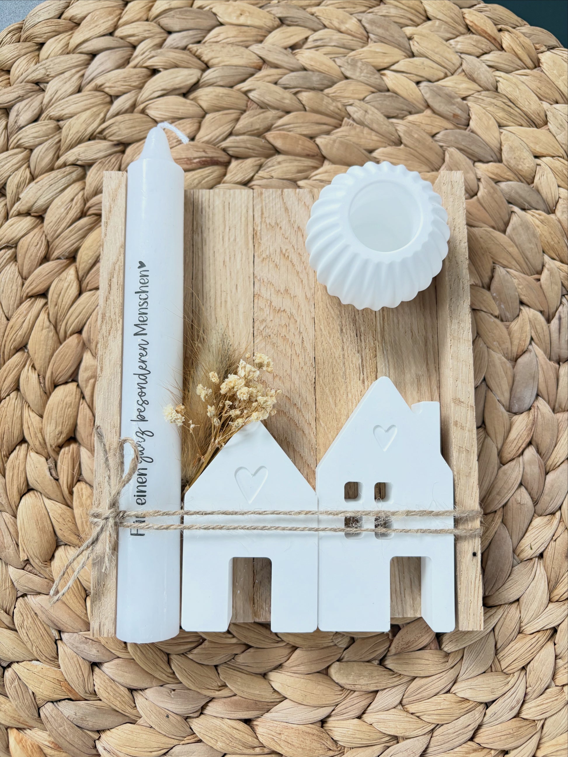 Dieses liebevolle Arrangement mit Kerze, Trockenblumen und den weißen Häuschen auf Holz bringt sofort Wärme und Herzlichkeit in jeden Raum. Perfekt als Geschenkidee oder als zauberhafte Tischdeko, die ein echtes Home Sweet Home-Gefühl verbreitet. 🏡🕯️🌿