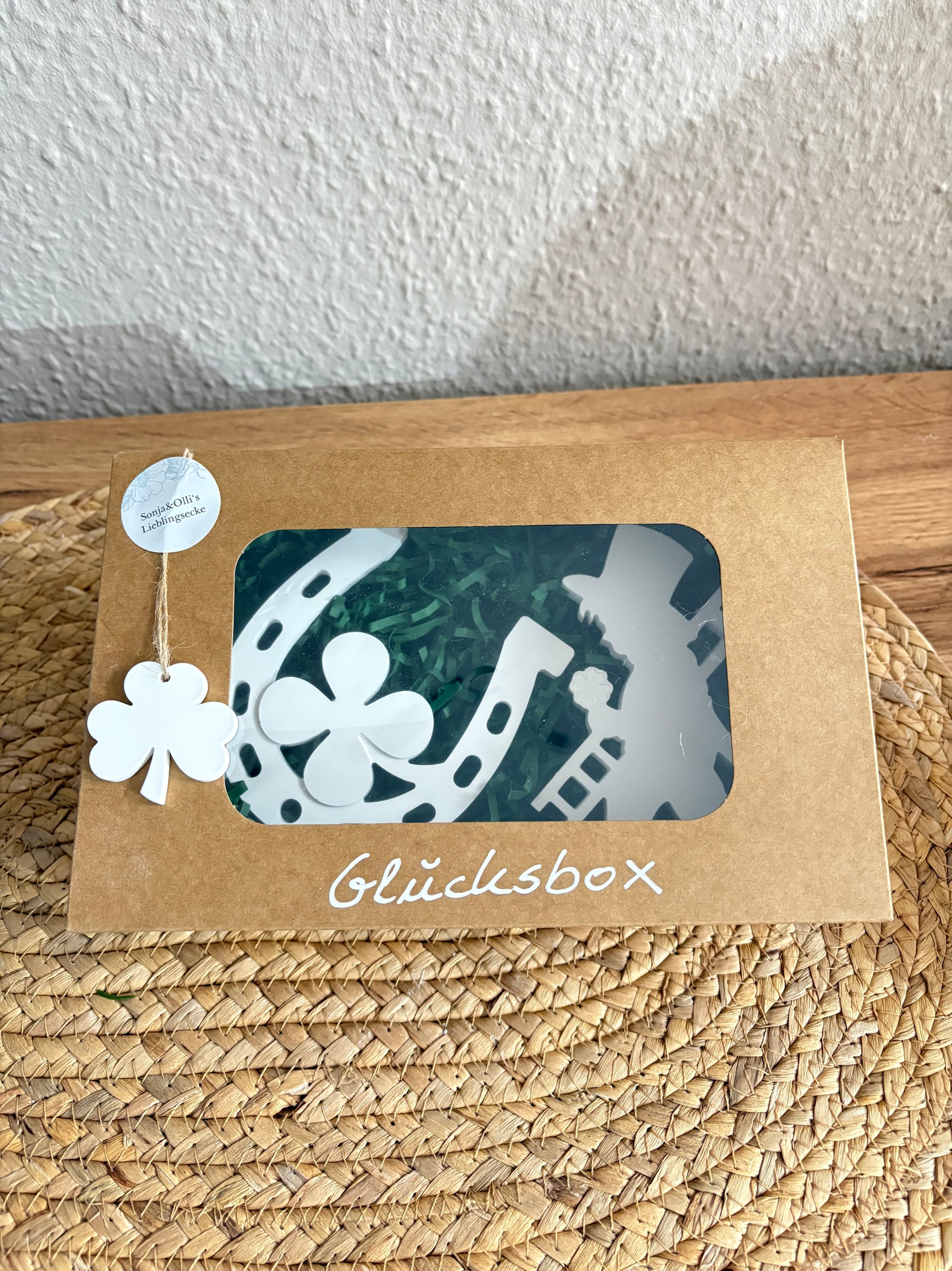 Eine liebevoll gestaltete Glücksbox, verpackt in einer schlichten, naturbraunen Geschenkbox mit Sichtfenster, durch das kleine weiße Glücksbringer zu sehen sind – darunter ein Hufeisen, ein vierblättriges Kleeblatt und eine dekorative Jahreszahl. Fein geschreddertes Füllmaterial bettet die Elemente ein und verleiht der Box eine hochwertige, festliche Ausstrahlung. Ein kleines Kleeblatt-Anhängerchen und ein zarter Aufkleber runden das Gesamtbild ab. Die Glücksbox ist ein wundervolles, persönliches Geschenk für Neujahr, besondere Anlässe oder einfach als liebevolle Geste voller Hoffnung, Freude und positiver Energie.