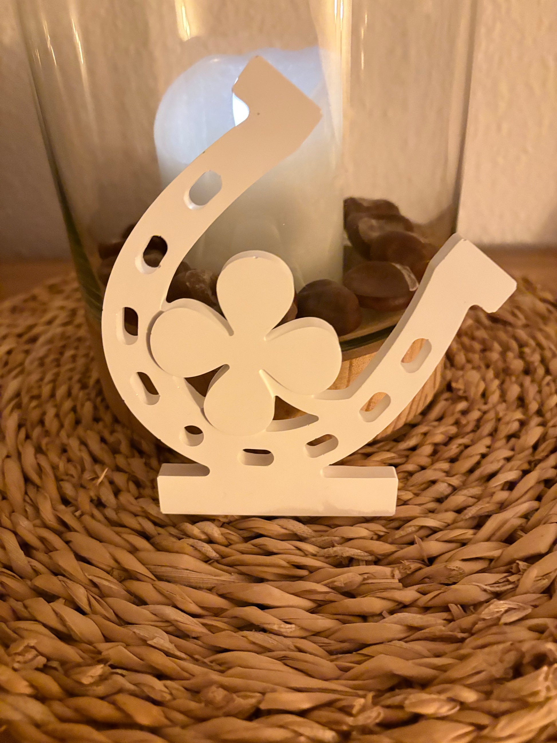 Ein kleiner Glücksbote auf leisen Sohlen. Das weiße Hufeisen steht da wie ein freundlicher Talisman, sanft beleuchtet vom warmen Kerzenschein. Davor die Kleeblume, fast wie ein Lächeln aus Holz. Zusammen sagen sie: „Hier darf Hoffnung wohnen.“ Es wirkt heimelig, ruhig und ein bisschen wie ein Wunsch, der gerade erst zu wachsen beginnt.