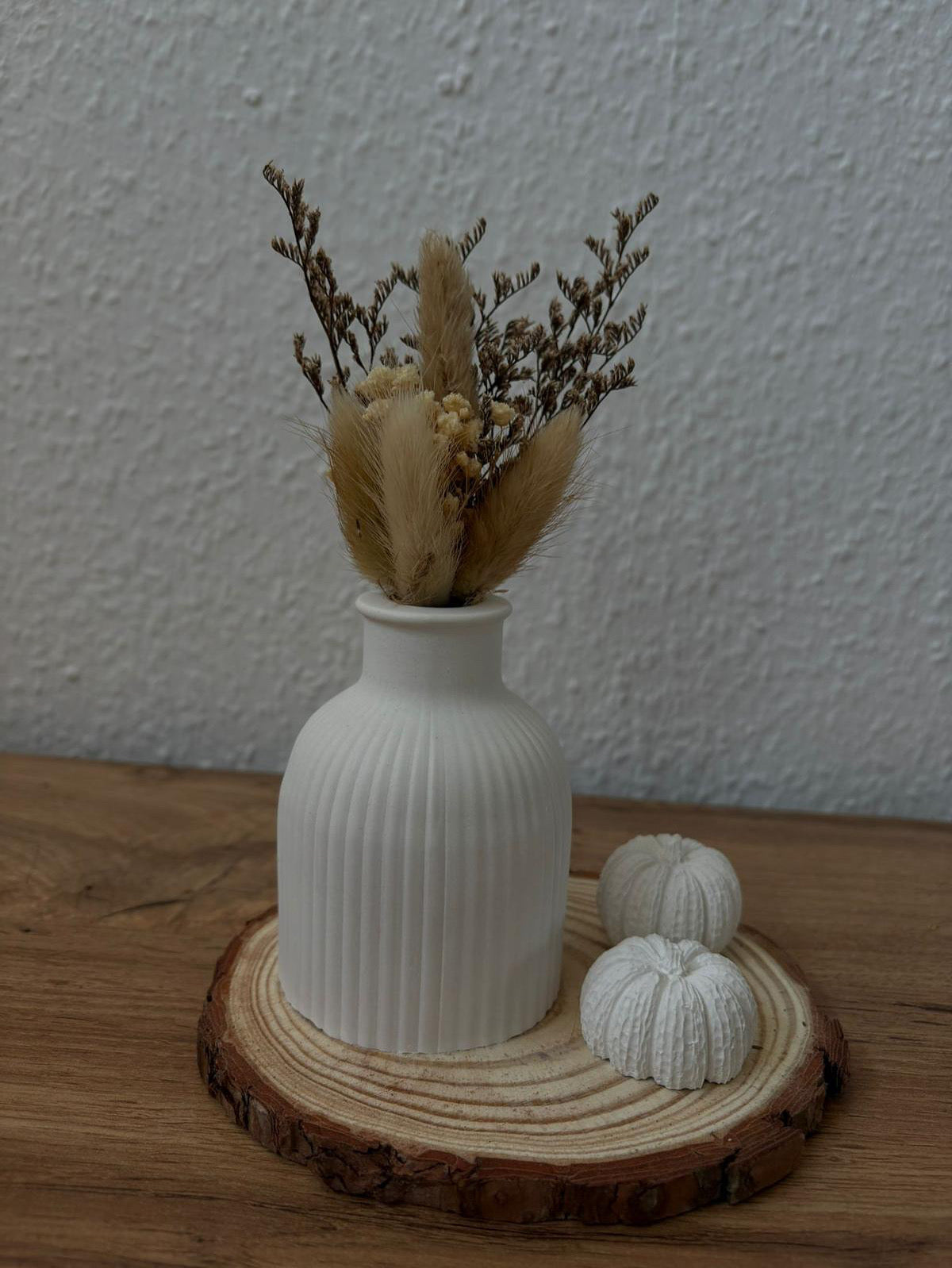 Ein schlichter weißer Keramikvase mit getrockneten Gräsern und zarten Blüten, dekoriert auf einer Holzscheibe – abgerundet mit zwei kleinen weißen Deko-Kürbissen. Natürliche Materialien, warme Töne und ein Hauch von Boho-Charme machen dieses Arrangement zu einem echten Blickfang. 🍂🤍