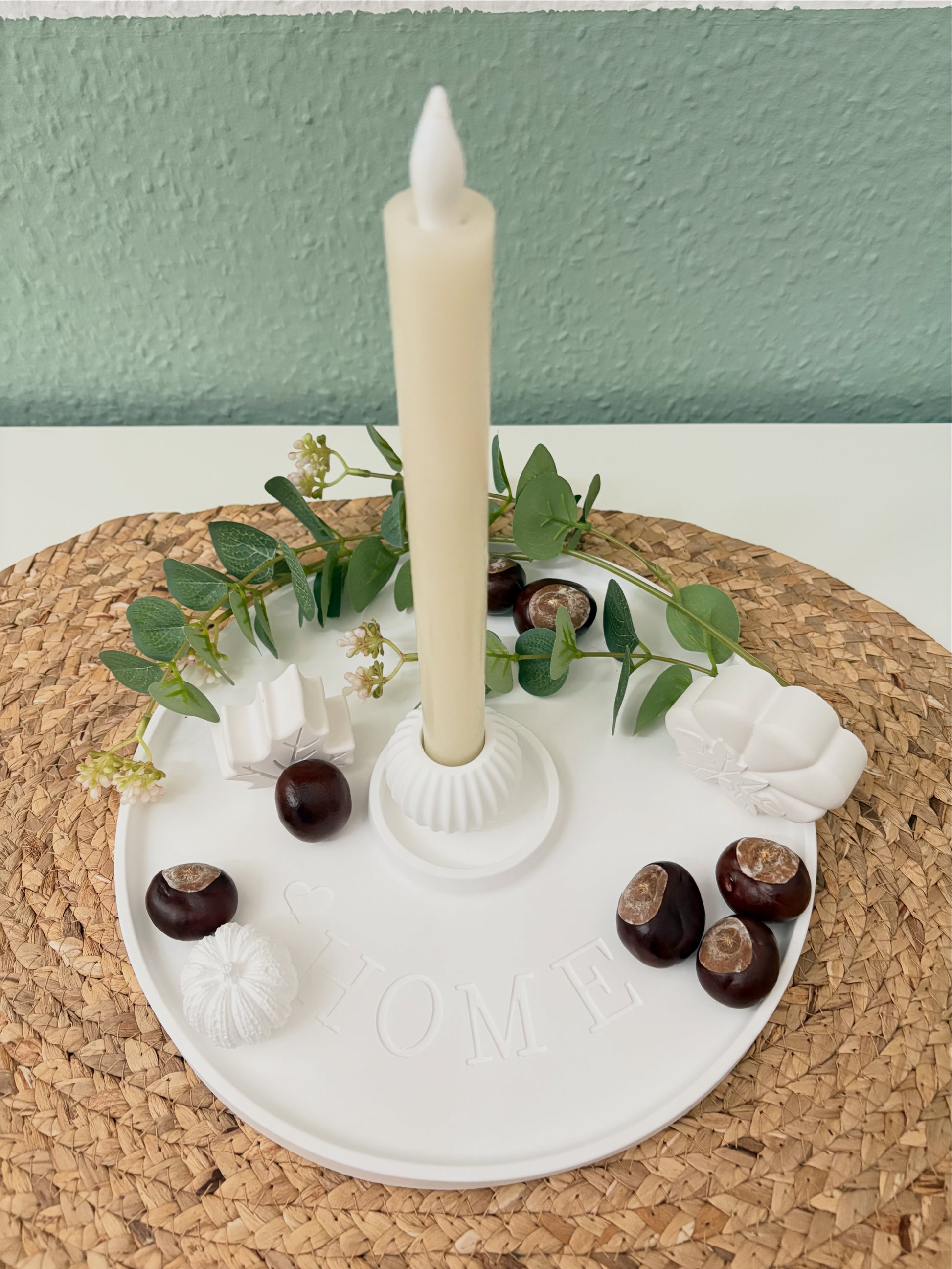 Dieses liebevoll dekorierte Kerzentablett bringt sofort ein warmes und einladendes Gefühl nach Hause. Mit der schlichten weißen Kerze, natürlichen Kastanien, zarten Blüten und grünen Zweigen wird ein perfektes Herbst-Ambiente geschaffen. Die Gravur „HOME“ unterstreicht das Gefühl von Geborgenheit und Ruhe – genau der richtige Eyecatcher für deine Tischdeko! 🍂🕯️