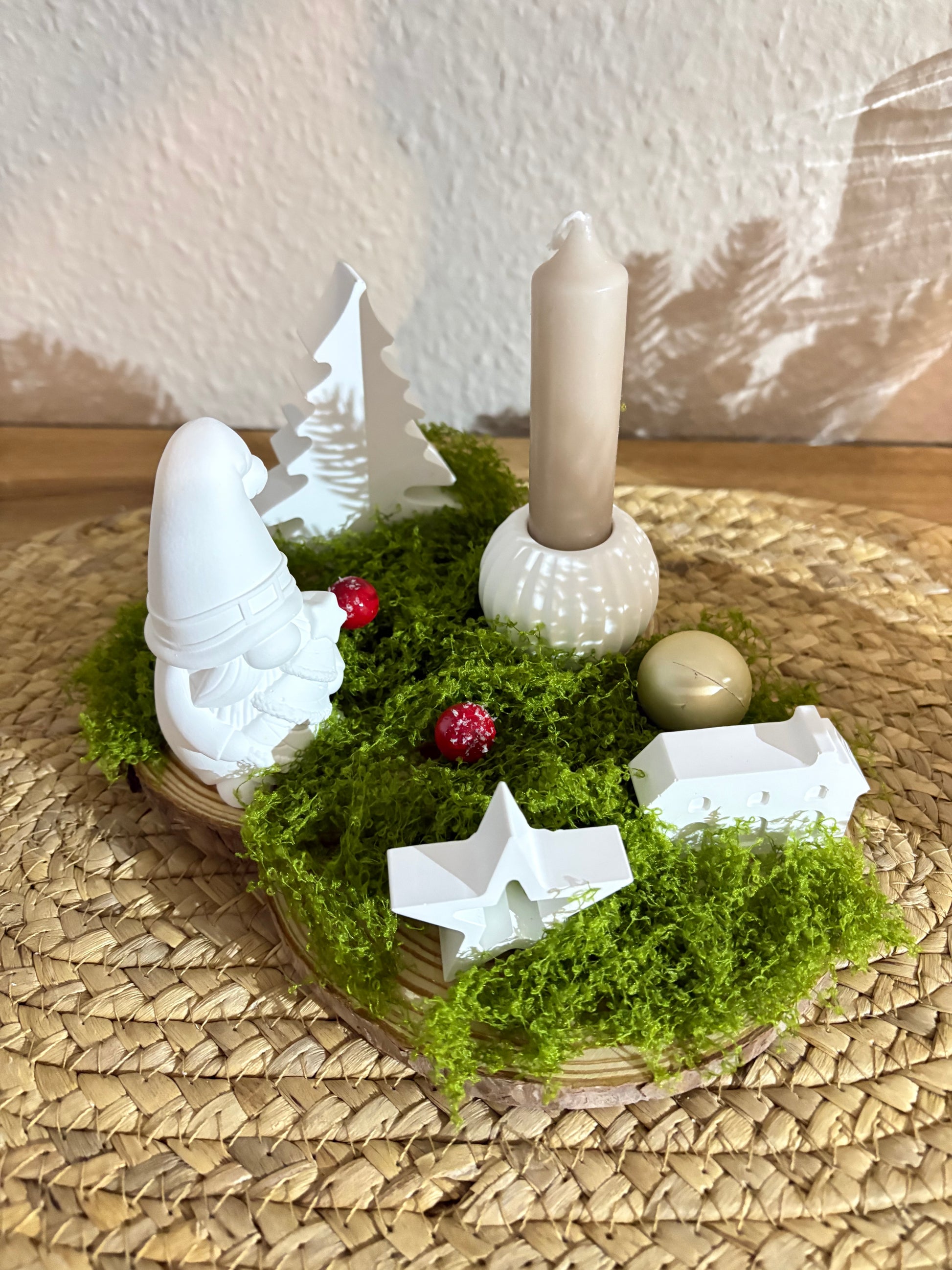 Dieses liebevoll gestaltete Winterarrangement bringt sofort eine gemütliche, märchenhafte Atmosphäre ins Zuhause. Auf einer natürlichen Holzscheibe entsteht eine kleine Winterwelt: Ein Wichtel mit roter Kugel, zwei weiße Häuschen, ein Sternenlicht-Dekoobjekt, ein Tannenbaum sowie ein eleganter Kerzenhalter mit passender Stabkerze stehen eingebettet in frisches, sattgrünes Moos. Die verschiedenen Elemente wirken harmonisch zusammen und lassen eine kleine, friedliche Weihnachtslandschaft entstehen – perfekt als Tischdeko, Geschenk oder als zauberhafter Blickfang in der Adventszeit.