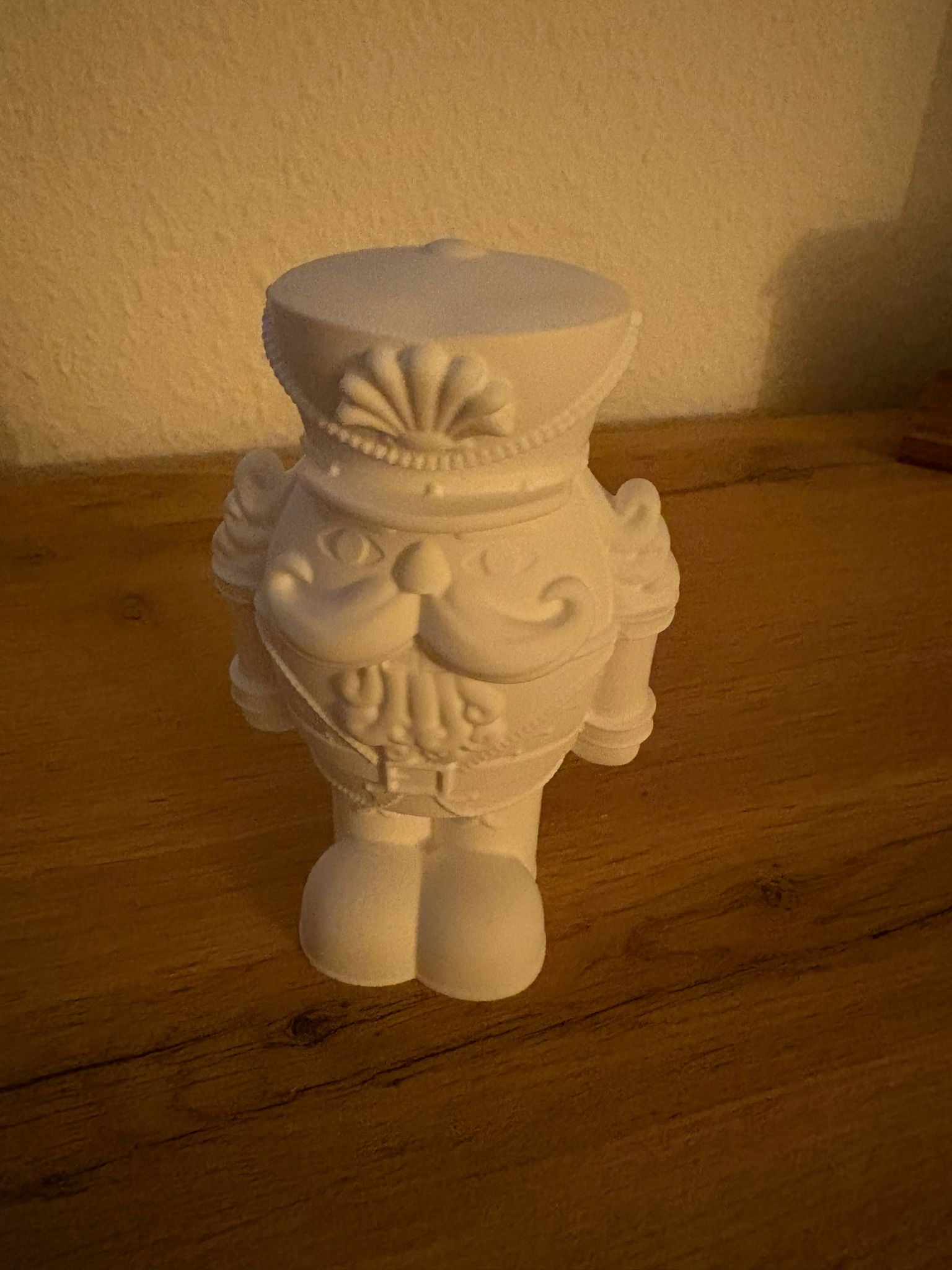 Diese kleine Figur steht da wie ein ruhiger Wächter der Adventszeit. Ein Soldat oder Nussknacker, ganz in Weiß gehüllt, als wäre er frisch aus einem Schneesturm spaziert. Seine feinen Verzierungen, der geschwungene Schnurrbart und die ordentliche Uniform lassen ihn klassisch wirken, fast wie aus einem alten Weihnachtsmärchen. Er bringt eine stille Eleganz mit sich, als wüsste er alle Geheimnisse der warmen Lichter und leisen Lieder.