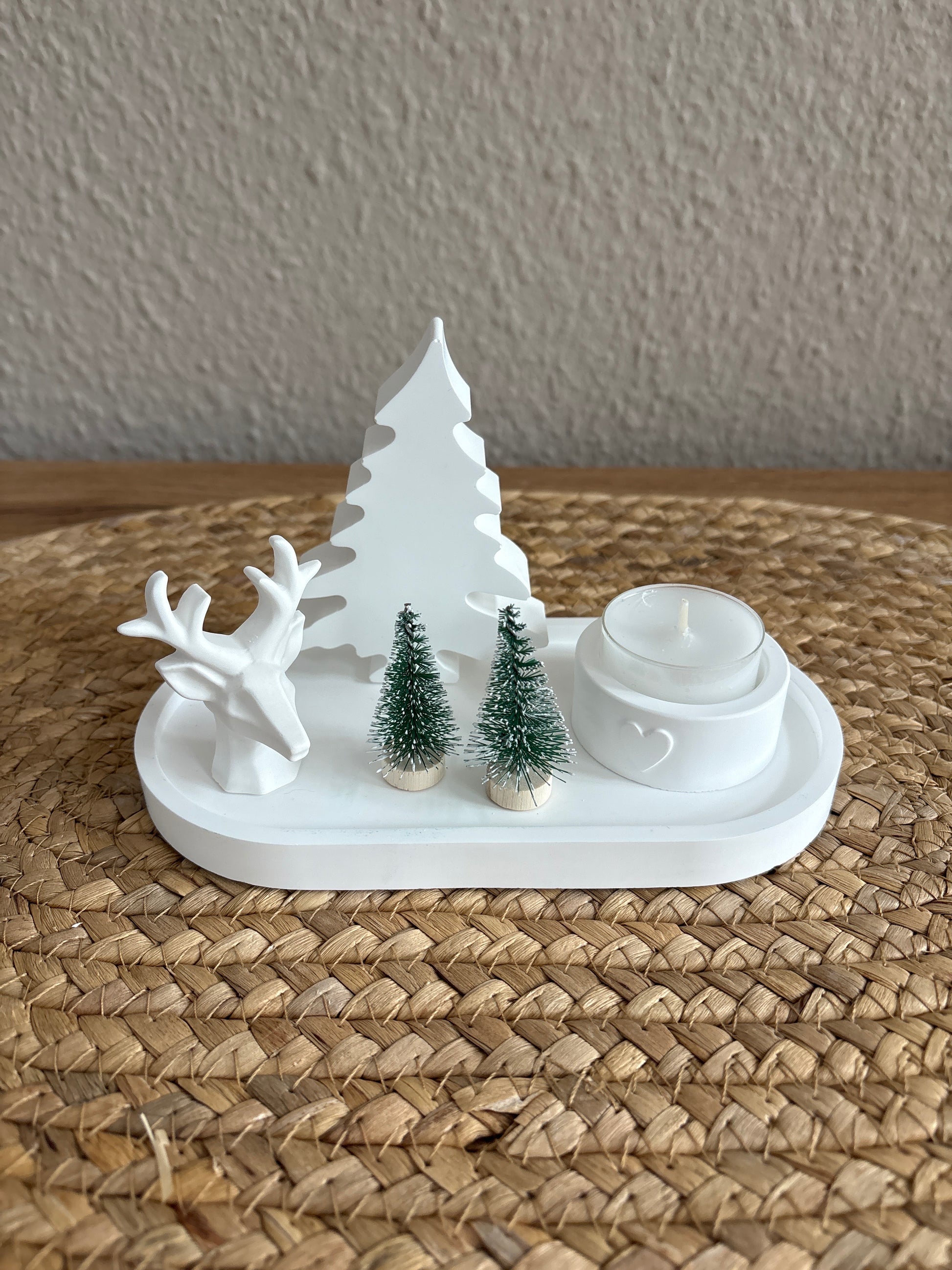 Ein winterliches Stillleben voller Ruhe und Harmonie – ein weißer Hirsch, kleine Tannenbäumchen, ein stilisierter Weihnachtsbaum und ein Teelicht bilden zusammen eine zauberhafte Mini-Winterlandschaft. Das schlichte Weiß trifft auf sanftes Grün und schafft eine elegante, nordische Weihnachtsstimmung. Perfekt für gemütliche Abende und ein liebevolles Detail auf dem festlich geschmückten Tisch. ❄️🕯️🌲✨