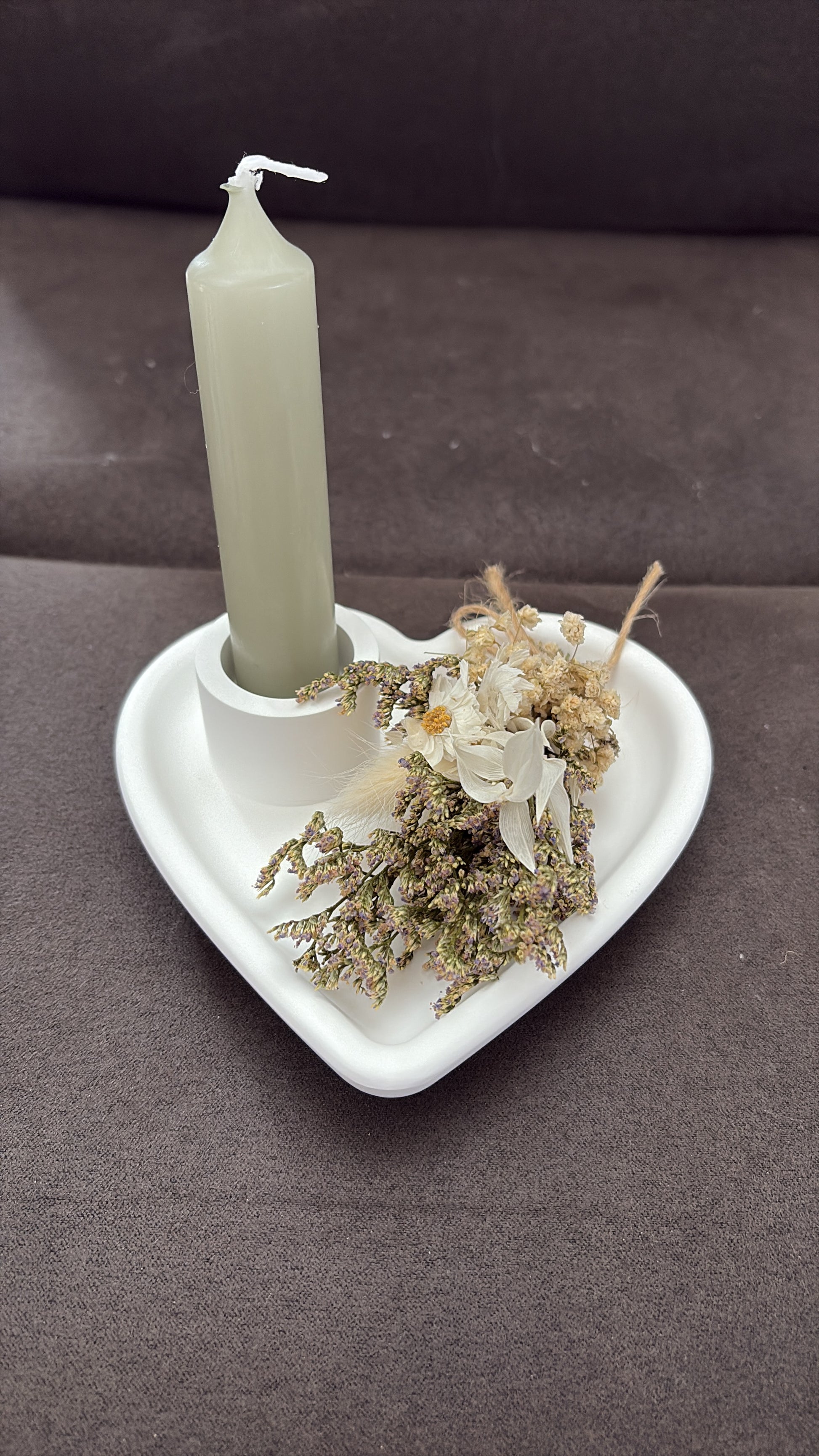 Dieser wunderschöne Kerzenhalter in Herzform ist ein echter Blickfang. Die zarte grüne Stabkerze wird von einem Bund Trockenblumen begleitet und schafft so ein Arrangement, das Natürlichkeit, Minimalismus und Romantik perfekt verbindet.