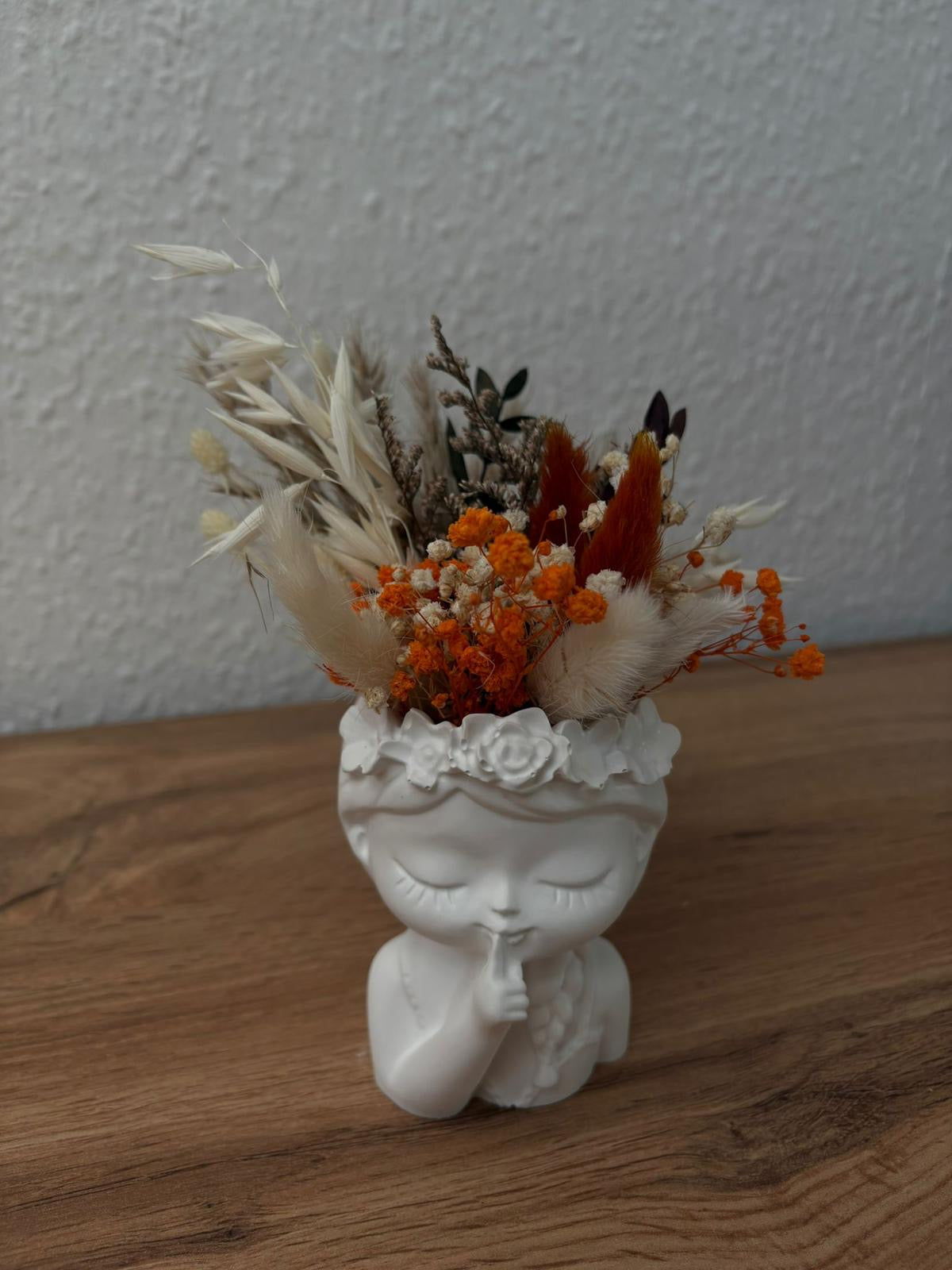 Diese süße Vasenfigur ist mehr als nur ein Deko-Objekt – sie ist ein echtes Statement-Piece. Mit geschlossenen Augen, geflochtenem Haar und einer zarten Rosenkrone strahlt sie Ruhe und Gelassenheit aus. Gefüllt mit farbenfrohen Trockenblumen in warmen Tönen wird sie zum charmanten Eyecatcher in jedem Raum.