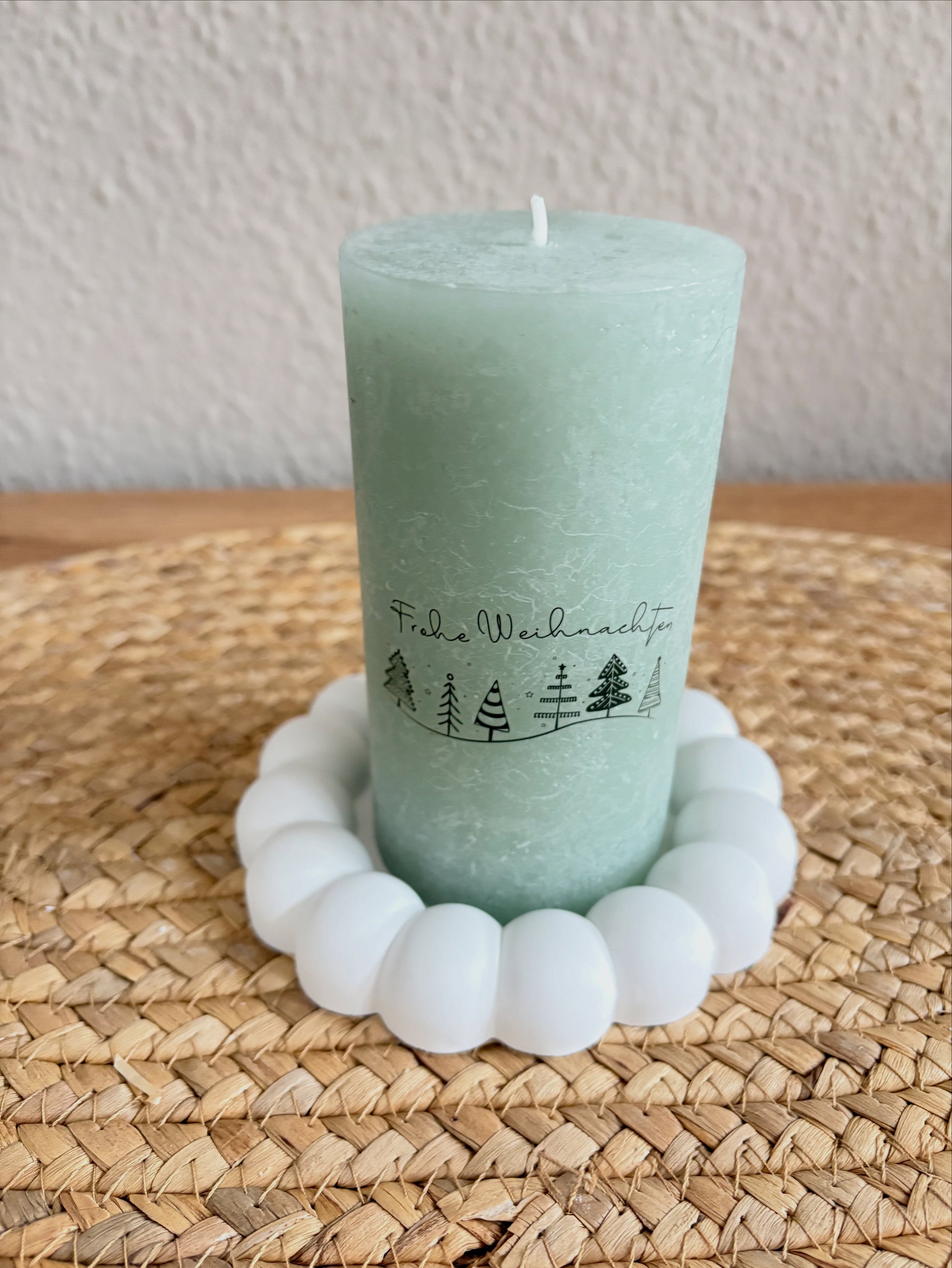 Schlichte Eleganz trifft auf winterlichen Charme: Eine sanft grün schimmernde Stumpenkerze mit der Aufschrift „Frohe Weihnachten“ und zarten Tannenmotiven sorgt für moderne, natürliche Weihnachtsstimmung. Umgeben von einem weißen, perlenartigen Kranz entsteht ein minimalistisches, aber stilvolles Deko-Highlight. Die Kombination aus sanften Farben, klaren Formen und feinem Design bringt Ruhe, Wärme und festliche Harmonie in jeden Raum. 🕯️🌲🤍